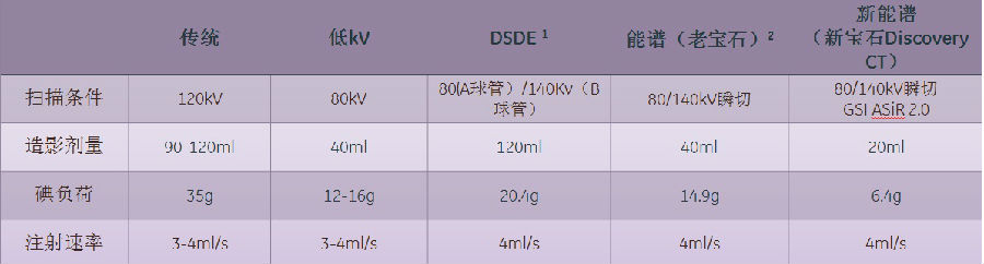 传统肺动脉CTA 多排螺旋CT,120kV 100 mL 浓度 350mg I/ml的造影剂,注射速率 4 ml/sec。1 低kV肺动脉CTA 多排螺旋CT,80kV 40 mL 浓度为 400mg I/ml的造影剂,注射速率 3.0 mL/s。2 DSDE肺动脉CTA 80kv(A球管)/140kV(B球管) 120 mL 浓度 170mg I/ml的造影剂,注射速率 4 ml/sec。3 肺动脉CTA能谱成像 宝石能谱CT,80/140kV瞬切 40 mL 浓度为 320mg I/ml的造影剂,注射速率 4.0 mL/s。4