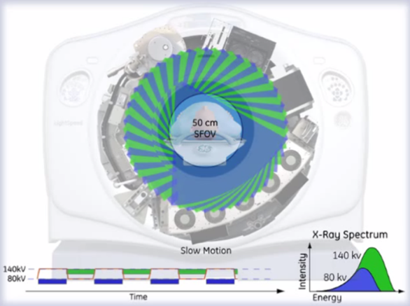 GE专利瞬切高压发生器在0.25ms内完成一次高压和低压的瞬时切换,实现80kV和140kV的同时性、同源性和同向性,确保在原始数据空间内实现心脏和全身的能谱成像。