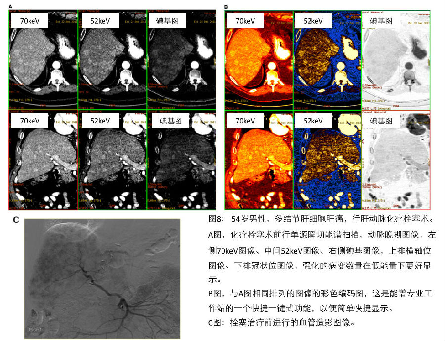 如图8所示,使用单源瞬切能谱的专业分析平台,可以在一个显示器窗口中并列对比观察低keV图像、70keV图像及碘基图像。实践表明,碘基图像同样可以增加病灶检出。彩色融合图像(见图8)、碘基图像、能谱HU曲线,结合方便单能量图像浏览方法,可以动态观察所有能量,以展示各种能量信息。 When images are viewed with dedicated rsDECT software, it is possible to view the lower keV images and 70 keV images side by side with iodine images & #40;Fig. 8& #41;, a practice which also enhances lesion detection due to the lower CNR of the iodine images. Color coding & #40;see Fig. 8& #41;, iodine threshold imaging, spectral HU curves, and a slide-bar that allows on the fly scrolling through all available energies provide additional means of presentation the dual-energy information.