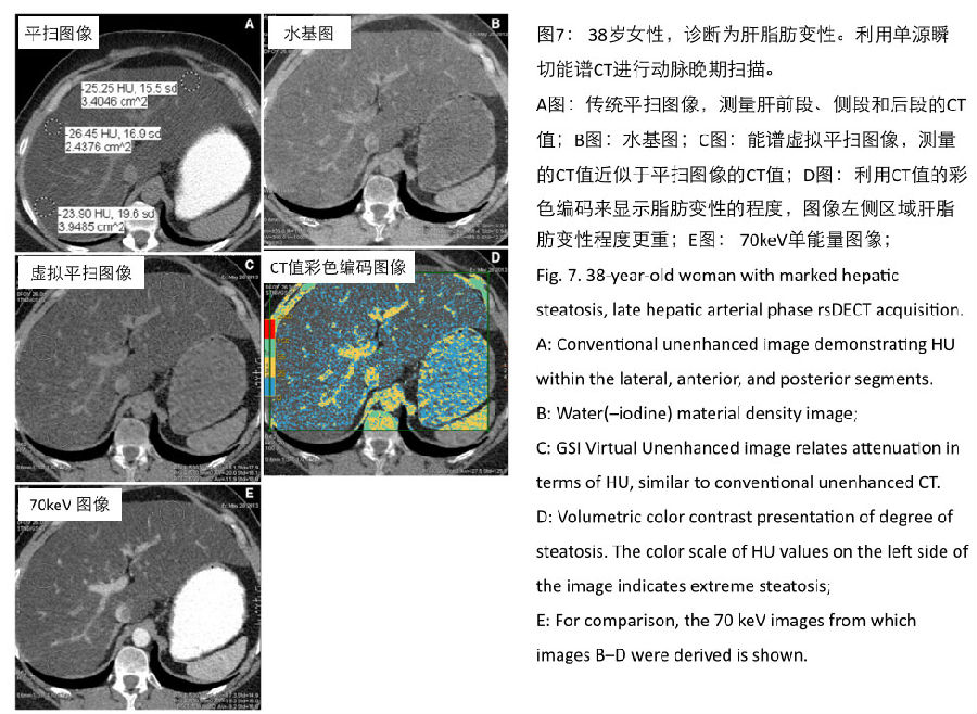 Joe等人进行了一个结合了体模和临床的研究,利用140kVp图像和80kVp图像间的平均密度差异,可区分含铁大于10%的肝脏,但是该结果和肝脂肪变性没有相关性 [45] 。请注意,上述研究的CT双能量数据都来自于平扫图像。 In a combined phantom and clinical study, Joe et al. [45] showed that the difference of averaged attenuation between the 140 and 80 kVp images could be used to differentiate patients with greater than 10% hepatic iron, but the same value did not correlate with hepatic steatosis. Note that the dual-energy acquisition for this study was without IV contrast enhancement. 在一个体模及小鼠肝脂肪变性的研究中,Artz等人对肝脏进行能谱平扫,体模研究显示肝实质密度及肝脂肪含量与甘油三酯含量高度相关;但在小鼠模型中,只有肝实质密度与肝细胞内甘油三酯的含量高度相关[46]。Zheng等学者应用一种创新的后处理方法,能够鉴别出人群脂肪沉积的不同程度[47]。 In a phantom and mouse model of hepatic steatosis, Artz et al. [46] demonstrated that attenuation and fat density of the liver parenchyma using unenhanced rsDECT correlated highly with triglyceride content in the phantom, but in the model, only attenuation correlated highly with triglyceride content in hepatocytes. Using novel post-processing of rsDECT monoenergetic image subtraction & #40;termed DESI& #41; in a patient population, Zheng et al. [47] were able to identify varying degrees of fat accumulation. 请注意,上述这些研究都是用双能CT进行平扫,并没有尝试对强化后的肝脏进行肝脂肪的定量分析。考虑到脂肪肝的高发病率,利用增强扫描的能谱数据就可以精确测量肝的脂肪含量(见图7),这对患者非常重要,因为患者就不用再增加一次平扫或者再去进行核磁共振的肝脏脂肪定量的检查。 Note that these studies did not attempt to address quantification of hepatic steatosis in a post-contrast setting. Given the prevalence of fatty liver disease, it will be important to use material-specific imaging capabilities to quantify hepatic fat after administration of IV contrast for patients who did not undergo an unenhanced SECT series & #40;Fig. 7& #41;. This is important, as the quantitative information of hepatic fat content can be gained from the images already acquired as part of the clinically indicated scan rather than having to suggest that the patient undergo a second unenhanced CT or an MRI for further evaluation.