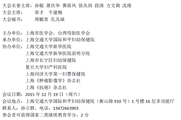 第七届海峡两岸母胎医学高峰论坛暨2015上海医学会围产医学超声研讨会将于2015年12月19日在上海举行。本次会议由GE超声独家支持,上海四大妇产专科医院院长担任名誉主席;讲课专家来自两岸三地,内容涵盖母胎医学、胎儿心脏、围产超声和生殖超声,是2015年末妇产超声领域最重要的学术会议。