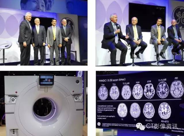 其次,我个人体会最深的是科技创新与转化对影像和健康的重要性。开幕式上,大会主席Ronald l. Areson, MD 就以“拥抱技术革新,开创放射未来”(Embracing Technological Innovation and Going Boldly Into Radiology's Future) 揭开了这次百年盛会关注新技术创新的主题。本人一直得到GE科学家团队的无私帮助和支持,特别是尊敬的郭英博士的帮助,才有幸不断接触到了宝石能谱这个新技术,也正因为宝石能谱新技术,才有幸参加这个盛会。RSNA每每有能谱技术的专场,都会全场爆满,印证了CT新技术对放射行业的影响力。随后,GE展台更深层次呈现这点,2015年11月30日上午,在全场瞩目和期盼下,GE董事长兼全球首席执行官Jeff R. Immelt和GE医疗总裁兼首席执行官 John Flanneny和两位嘉宾陪同下亲临会场,并和在场参会放射人员一起研讨了技术革新和生命健康的意义与联系。使我们从这个高规格的研讨会中感受到技术革命对放射和健康的重要影响力。随后,最有代表性的Revolution CT和MR750W逐一亮相,两款机器的静心技术和快速成像技术引起会场人们的高度关注,特别是MR750W,一次扫描可以生成6个序列成像(可以生成T1,T2,T2Flair,T1Flair,Psir,STir,PD),其耗时只5分30秒。因此,我大胆预测这个技术革新将进一步推动MRI普及和应用,未来某一天MRI可以常规应用于急诊检查而不再是梦。同时,加快扫描速度无论对病人和医院都是大有裨益的。