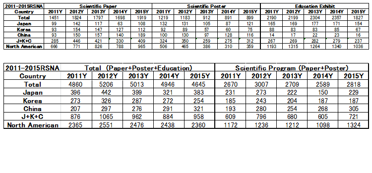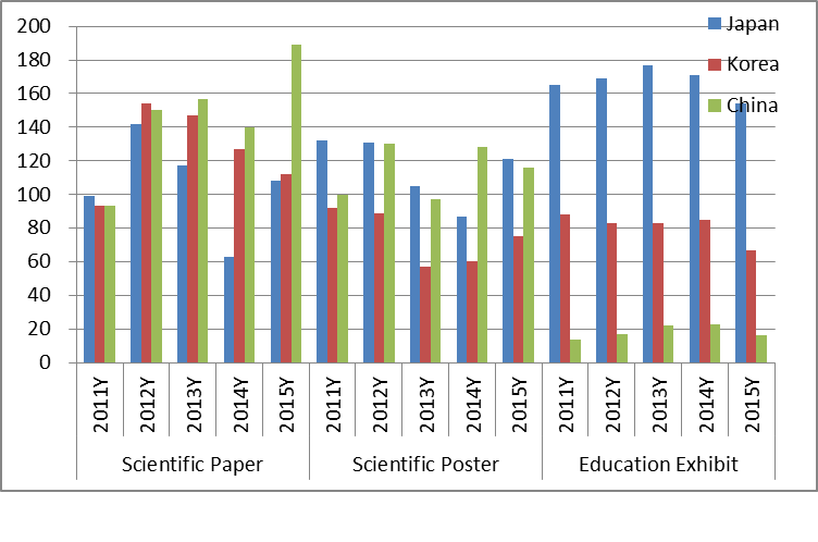 本届年会,所有的学术发表(Scientific Paper + Scientific Poster + Education Exhibit)的全球总数为4645篇,北美(美国和加拿大)学者的发表为2360篇,占总数的50.8%,中国(包括台湾和香港)、日本、韩国的发表数及占比分别为321篇(大陆为298篇)和6.9%、383篇和8.2%、254篇和5.5%。详细数据比较见下表。