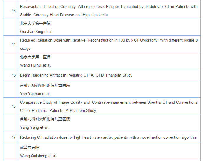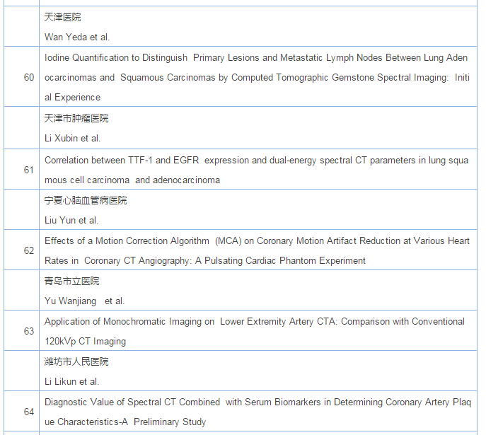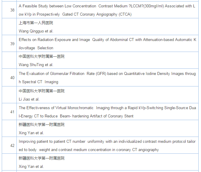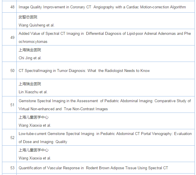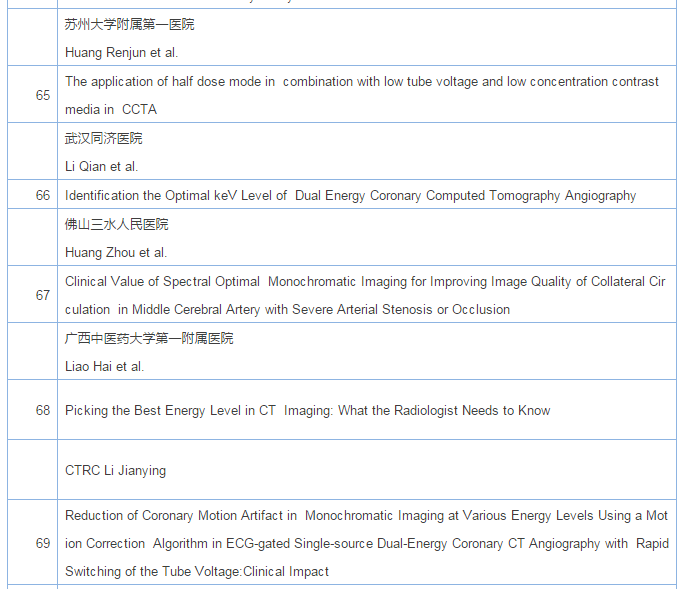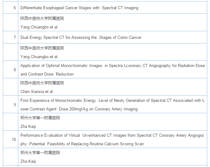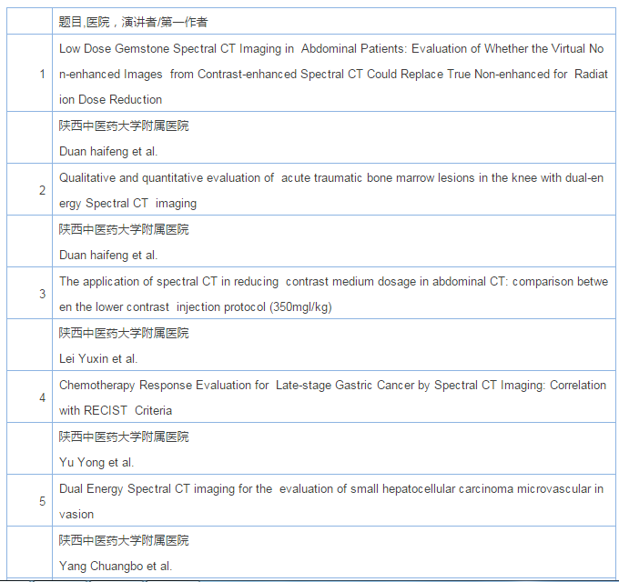 其次是心脏方面,除了SSF、IBR等技术都有相应的文摘发表之外,心脏能谱成像此次有6篇文摘,内容涵盖了心脏的能谱双低研究、冠脉能谱最佳单能量显示血管和减少硬化伪影的研究,这里面更为夺人眼球的内容有3篇,分别是GSI+SSF的研究、心脏能谱虚拟平扫研究、冠脉斑块的能谱分析。相关数据列表如下。