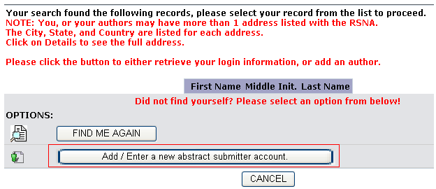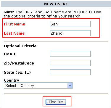 如果您是第一次投稿RSNA,又从未注册过自己的账号,那么需要注册新的用户名,首先输入First Name和Last Name,点击Find Me。如下图所示: