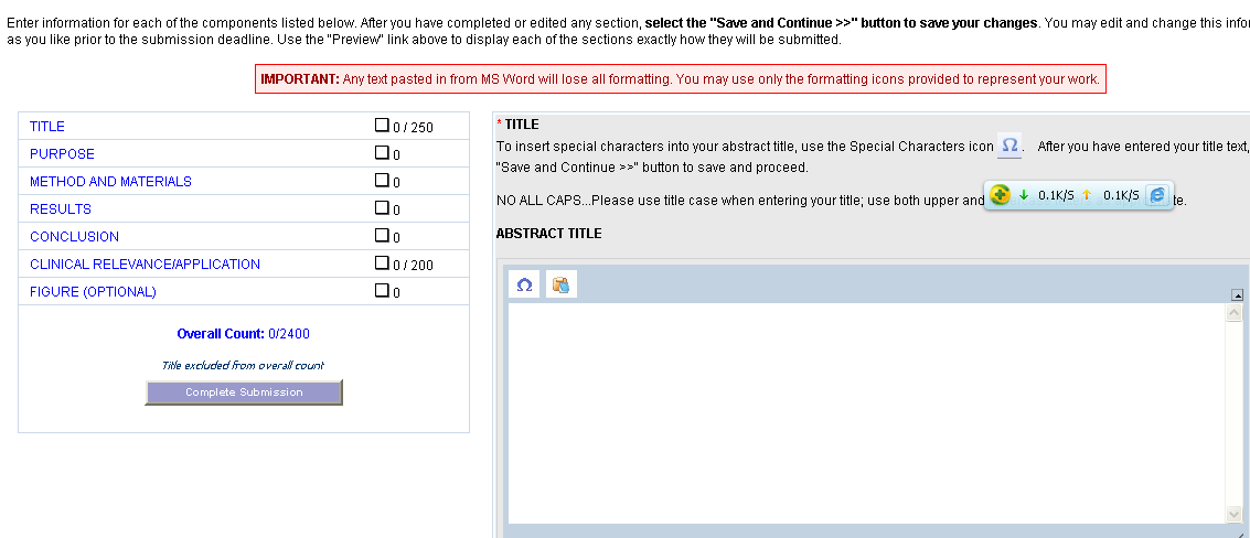 8、填写摘要内容 摘要内容包括TITLE,PURPOSE,RESULTS,METHOD AND MATERIALS,CONCLUSION,CLINICAL RELEVANCE/APPLICATION。每一部分都有字数限制,不能超过规定字数,否则不能递交点击Continue进入下一步。除文字外,还可以附上一张JPG格式的图片。