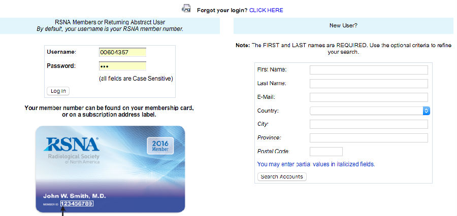 1、登陆或注册自己的账号 首先打开RSNA 2016的投稿网址:http://abstract.rsna.org/。如果您是RSNA会员或曾经投过稿,可以直接输入用户名和密码进行登陆。