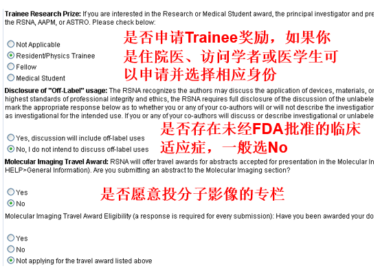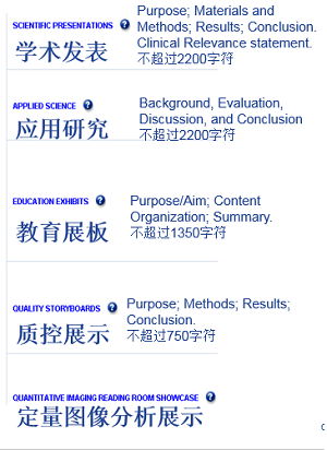 3、选择递交类型 点击您要递交的类型,RSNA 2016较之以往类型更多,可根据自己的需要投稿。通常会选择学术发表和教育展板两种类型。当然,根据自己的实际情况亦可选择其他类型。各版块的相关信息如下: