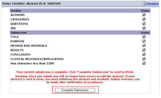 9、完成摘要并递交 完成摘要各部分内容后点击Complete Submission,查看Status Checklist,确认无误后点击Checklist下的Complete。Submission递交到RSNA。一旦确认递交后将不能修改,否则须撤销后重新递交。