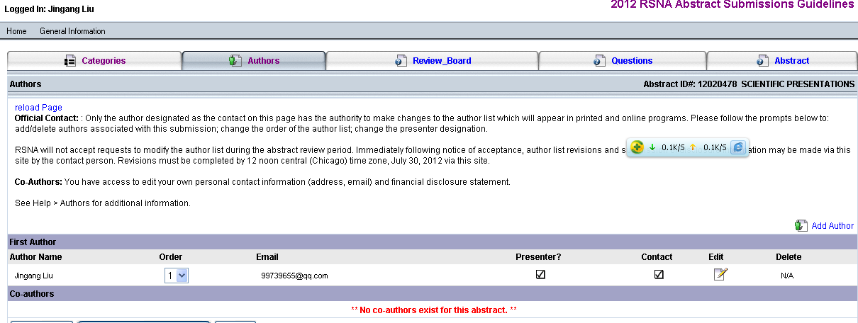 5、填写作者 RSNA摘要中只能显示前6个作者,其余的用et al表示,确定演讲者(Presenter)和联系人(Contact)并添加其他作者(Add Author)。此外,任何增加的作者都需要其详细信息,增加方法与注册时填写个人信息的内容和方法类似(Find、New……)。