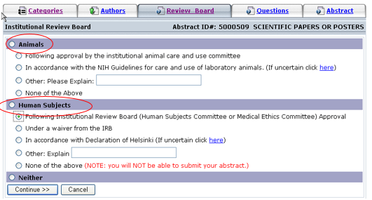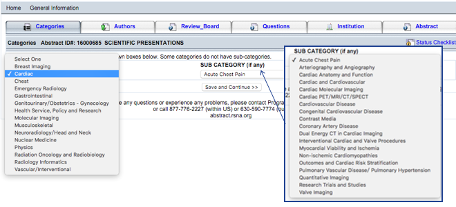 4、选择摘要类别 以下小编以选择《学术发表》类投稿为例做如下详细介绍。依据摘要内容,选取合适的Category和Sub Category。例如,您的摘要内容是关于64排CT心脏成像的,PATIENT CATEGORY就选择Cardiac,SUB CATEGORY就选择CT。