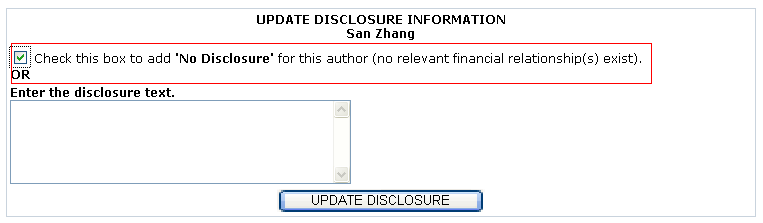 此外,登陆后还需Update disclosure,通常选择‘No Disclosure’,然后点击确认。对于摘要中您需要添加的其他作者也要进行该项选择。