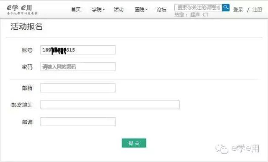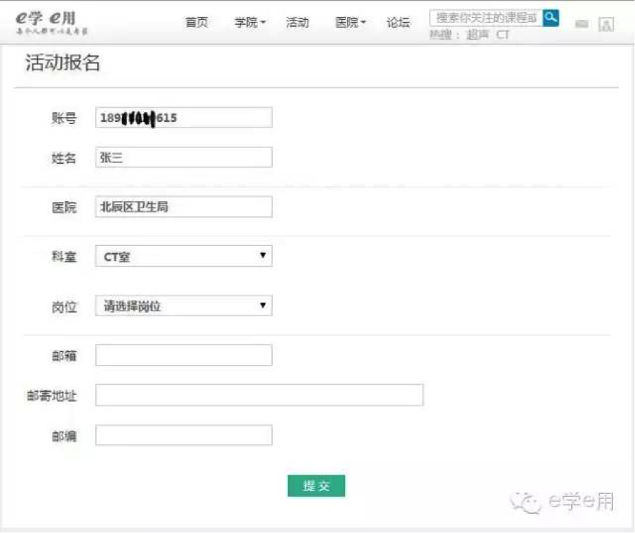 图4报名页面 快速提交在报名页面输入你的个人信息,填写完毕后点击页面底部的“提交”按钮即可报名。 网站已注册用户输入您的e学e用账号后,系统会自动识别并出现“密码”栏(如图5),输入密码后用户信息自动载入,点击提交即可(So Easy!)。 若用户信息不完整,需要在第一次报名参加活动时补充岗位与邮箱等信息,然后提交(如图6)。