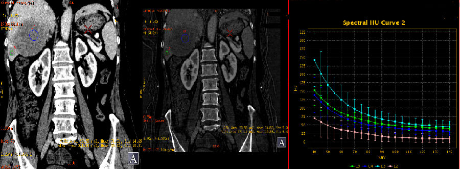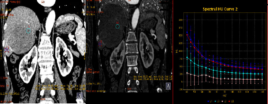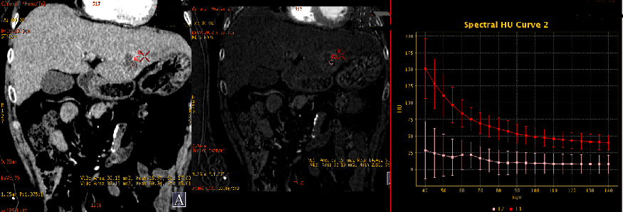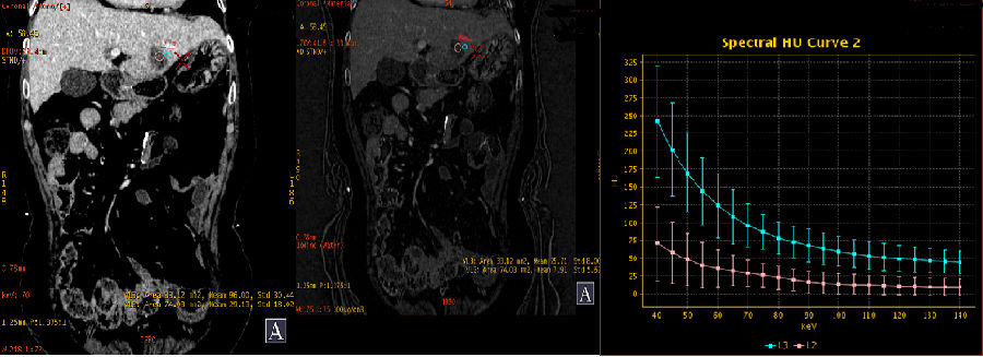 能谱曲线可更加直观的从病灶动脉期强化程度及持续时间对肝脏富血供占位进行鉴别,应用强化前后能谱曲线的高度和斜率变化来评估病变的血供特点,结合血管显示的最佳keV图像,可从多个角度反映病变特征,达到诊断和鉴别诊断的目的。