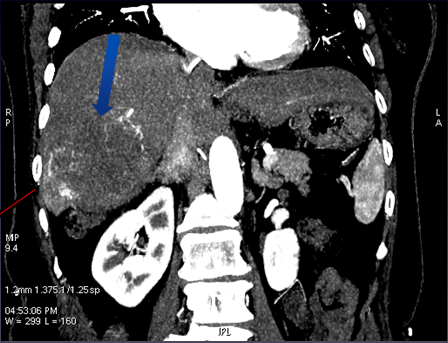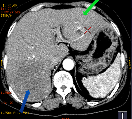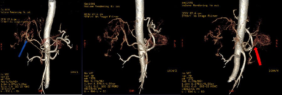 图中红、蓝箭头显示肝左右叶病灶分别来源于肝左右动脉