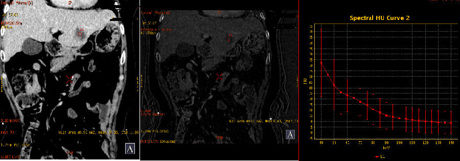 临床资料:女性,66岁,肠道间质瘤术后7个月,常规复查,超声发现肝脏多发病变,为明确病变性质进行CT增强能谱扫描。