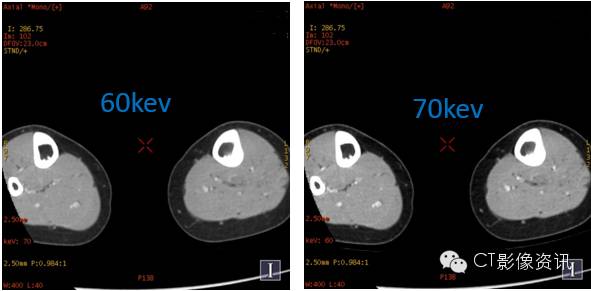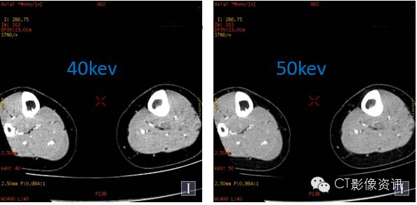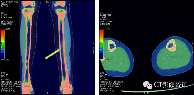随着单能量水平的减低,左侧胫骨髓腔内的病变显示更加明显;低能量水平图像,可以很好显示小病灶以及轻微的强化病变。 左侧胫骨中段髓腔内转移