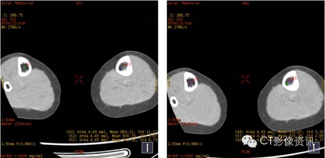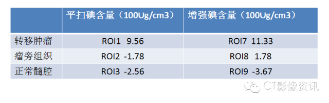 增强扫描后肿瘤组织、瘤旁组织的碘含量升高,而正常髓腔的碘含量变化不大。
