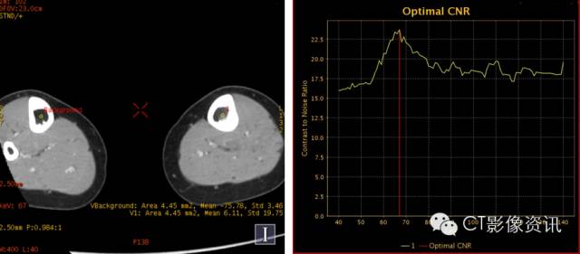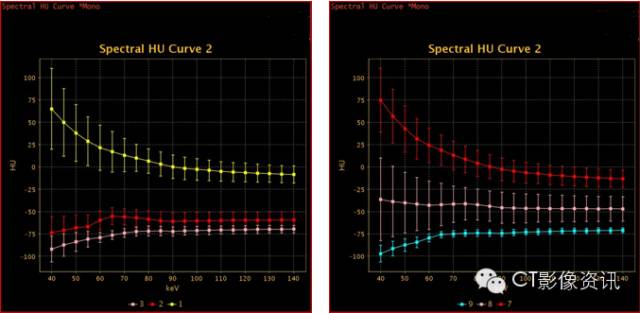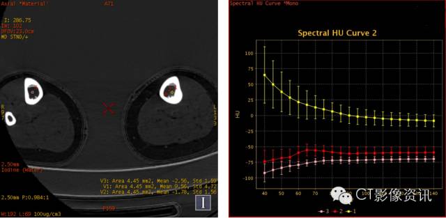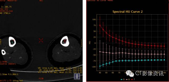 增强:红色曲线肿瘤组织内碘含量升高,粉色曲线肿瘤旁髓腔内碘含量较平扫增高。曲线变平(有别于脂肪的反向曲线形态),表示有肿瘤浸润的情况;蓝色曲线表达对侧正常髓腔碘含量没有变化。