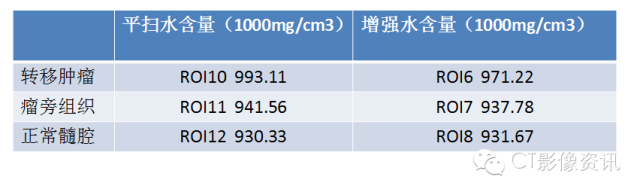 平扫以及增强的肿瘤组织、瘤旁组织、正常髓腔中水含量变化不大。