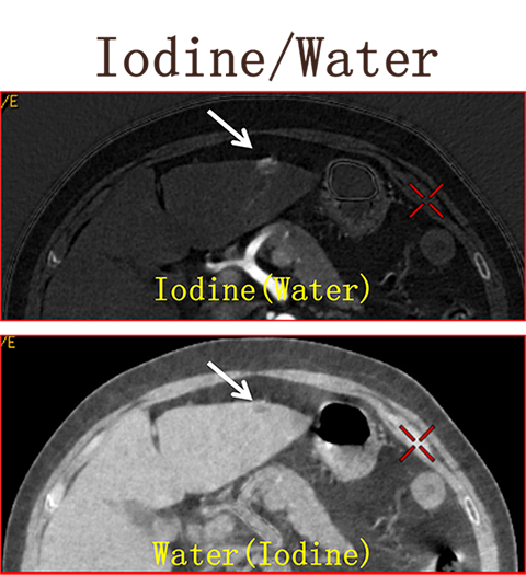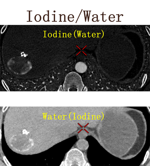 碘图呈高密度 水图呈高密度 提示高密度影不是强化