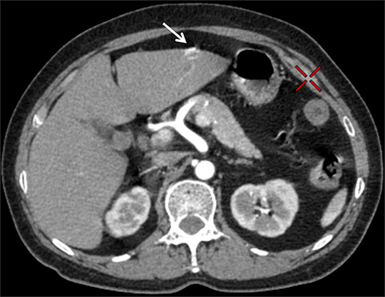 肝左叶环形高密度影 强化?环形钙化?