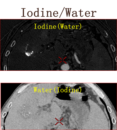 利用Water/Iodine基物质图像区分增强和血肿 利用Calcium./Iodine基物质图像区分钙化和增强 利用Water/Calcium基物质图像区分钙化和血肿