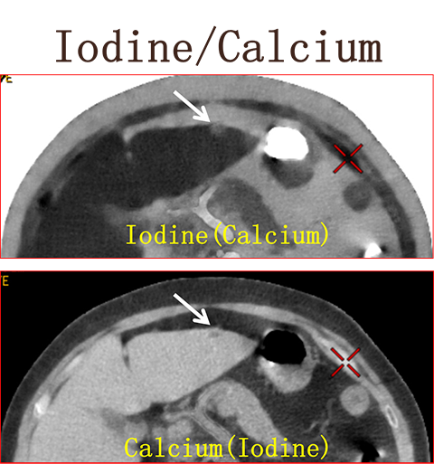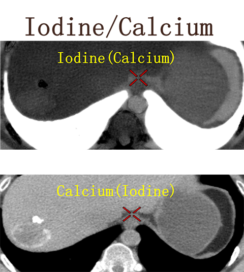 碘图呈高密度 钙图呈低密度 提示高密度影为含碘物质