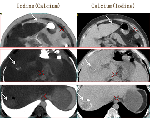 碘图呈低密度 钙图呈高密度 提示高密度影为钙化