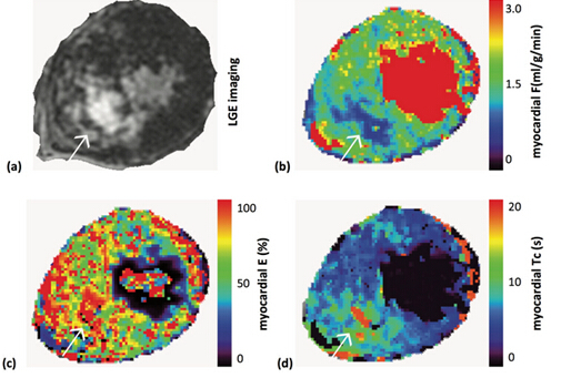 已知首过动态对比增强DCE-MRI联合动力学分析模型是定量心肌F的有效工具,但还未对心肌的渗透性达成一致。最近,一种绝热组织近似同质性模型(AATH)和二室交换模型(2CXM)已经被公认为脑部、胸部和前列腺F和PS定量的潜在方式。该研究旨在调查首过DCE-MRI联合2CXM和AATH在健康受试者和肥厚型心肌病(HCM)患者中进行心功能评估的可行性。 该项研究中,所有检查使用1.5 T GE MRI进行(14名 HCM患者,12名健康受试者,无年龄差异)。MF分析中,h(t)由被去卷积的AIF对组织增强信号确定,然后计算出F、Vp与MTT图。对于2CXM和AATH,F、Vp、 MTT、 E和PS图使用Levenberg-Marquardt非线性最小二乘法得出。由于在HCM患者中,室间隔是描述不对称肥大最有代表性的区域,在中间短轴位切片中使用人工分割计算局部F、Vp、MTT、E和PS。采用Bland-Altman图去证实2CXM和AATH联合MF的一致性(F、Vp和 MTT的均值作为X轴,差异作为Y轴)。研究人员报告两种方法的平均差、95%一致性界线和Pearson相关系数。关于模型输出结果的验证,通过独立样本t检验,正常组和HCM组的定量心功能参数(F、Vp、MTT、E和PS)被比较。 结果显示,2CXM 中有一个样本低于及AATH中一个样本高于95%一致性界线,证明在F定量中两种方法联合MF的高度一致性。关联图显示Y(F2CXM)vs X(FMF)的斜率为1.42(截距=-0.19 mL/g/min,ρ=0.88),Y(FAATH)vs X(FMF)的斜率为1.23(截距=0.12 mL/g/min,ρ=0.82)。所有这三种方法之间 Vp的平均偏差为0.02 mL/g & #40;-0.11~0.08 mL/ g,95% CI& #41;。2CXM中两个样本和AATH中一个样本低于95%一致性界线。Y(Vp2CXM)vs X(VpMF)的斜率为1.28(截距=-0.04 mL/g,ρ=0.70),Y(VpAATH)vs X(VpMF)的斜率为1.15(截距=-0.01 mL/g,ρ=0.44)。三种方法的MTT的平均偏差为2.8秒(-8.7~14.4,95%CI)。2CXM中两个样本低于95%一致性界线,AATH中无。Y(MTT2CXM)vs X(MTTMF)的斜率是1.28(截距=-5.96s,ρ=0.60),Y(MTTAATH)vs X(MTTMF)的斜率为0.59(截距=1.83 s,ρ=0.39 )。对于AATH和2CXM心肌渗透性比较,E平均偏差是35.1%(-10.8%~80.7%,95%CI),PS的平均偏差为0.23 mL/g/min & #40;-0.75~1.20 mL/g/min,95%CI& #41;。然而,在这两种方法之间E或PS无统计学显著相关性(P> 0.05)。下图显示了一个HCM患者通过AATH获得的特征性参数。短轴位延迟增强T1加权成像显示的室间隔和下壁中肥厚心肌显示明显的延迟增强。对于来源于AATH的渗透性图,在局部F中显示不均一下降,E 和Tc中的不均一增加,尤其是在心肌纤维环的部位,表明血液供给受损、有关心肌的结果异常。