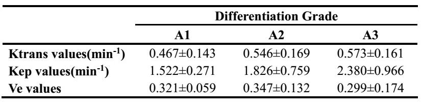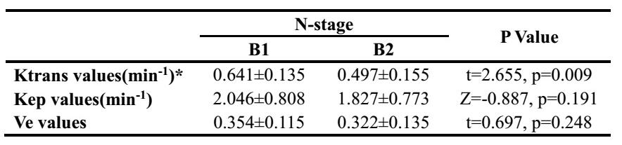 图1: 淋巴结转移组的平均Ktrans 值& #40;B1,0.864min-1& #41;;淋巴结未转移组& #40;B2, 0.53min-1& #41; & #40;某些特定片段& #41; 表1:A1、A2 和A3的Ktrans值、Kep值和Ve值(均数±标准差)