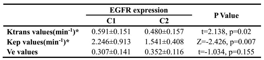 表3:C1和C2的Ktrans值、Kep值和Ve值(均数±标准差)