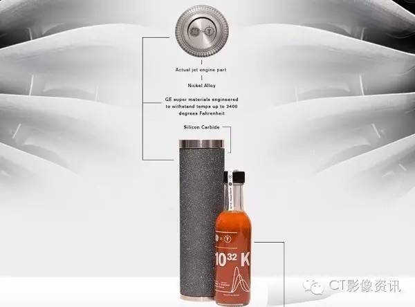 GE用这种方式让大众更好的理解这种发明背后的科学。飞机引擎内温度越高,其工作效率越高,同时碳排放就越少。GE研发的陶瓷复合材料(ceramic matrix composites)可以抵抗2400度的高温,比目前最高端的合金材料还高400度。这种陶瓷复合材料是由比头发丝细5倍的碳化矽纤维组成的,并且重量超轻。有什么材料比能抵抗引擎2400度高温的陶瓷复合材料更合适做1032 K辣酱的包装罐呢?