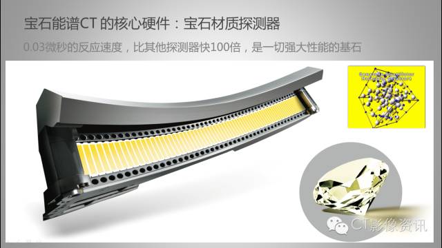 GE是材料学的领导者,高科技材料的研发不仅应用于航空,还应用于医疗。探测器是CT的核心部件,是CT成像质量的保障。在过去的20年里,探测器的材质一直没有发生变化。为了提高CT成像的空间分辨率、密度分辨率,以及满足能谱这种新成像方式,GE决定研发能够支撑未来20年CT发展的新材质探测器。历时7年,投资3千3百万美金,筛选15万种化合成分,终于在2007年研发出可以工业化生产的具有宝石晶体结构的全新探测器——宝石探测器。与传统稀土陶瓷探测器相比,宝石探测器可以提高100倍的反应速度、20倍的放射稳定性、4倍的清空速度、2.5倍的采样率。这些物理特性保证宝石探测器具有极高的空间分辨率(0.23mm)和密度分辨率(5mm@0.3%, 4.4mGy),并且能够超快速接收和清空海量的能谱数据,实现能谱成像。拥有宝石探测器的超高端CT在心血管成像领域、肿瘤成像领域和低剂量成像领域都成为无可比拟的王者。