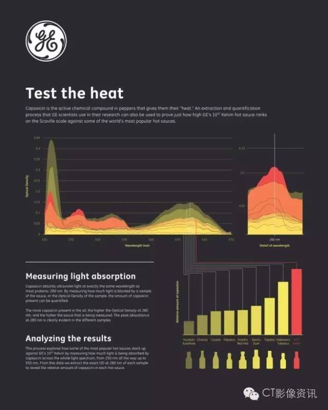 ▲紫外光谱显示GE 1032 K超级辣酱的辣度(红色)是最高的。(Source:GE SWEEPS)