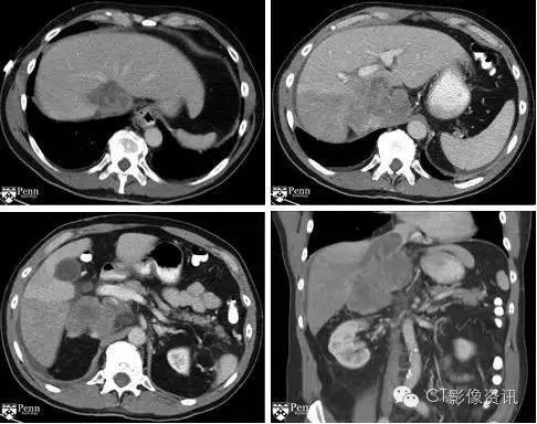 下腔静脉肝内段区域可见一巨大异源性肿块。血栓延伸至右心房及肝右静脉,造成肝右叶后段灌注异常。