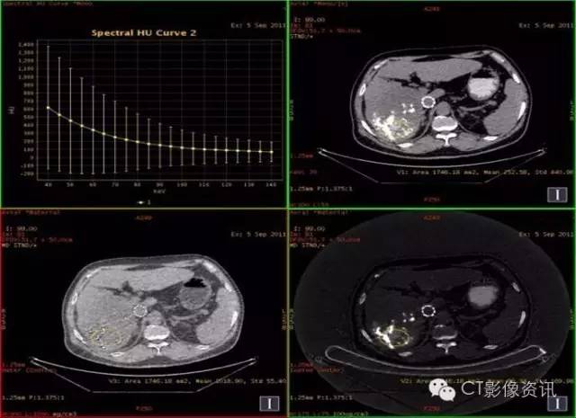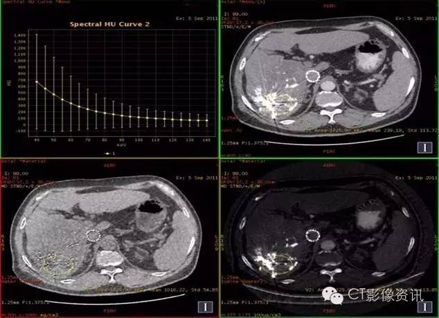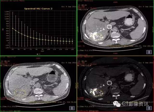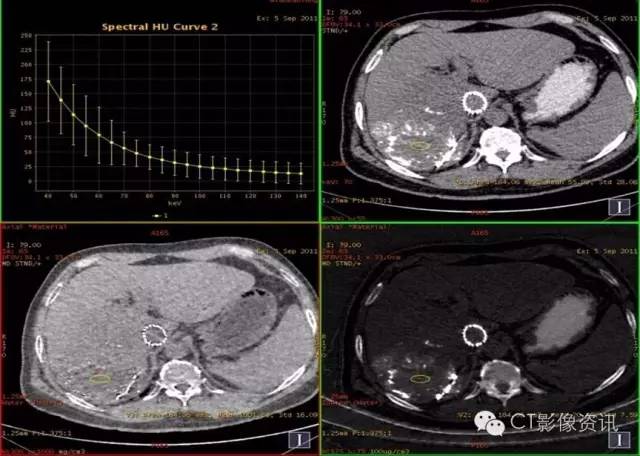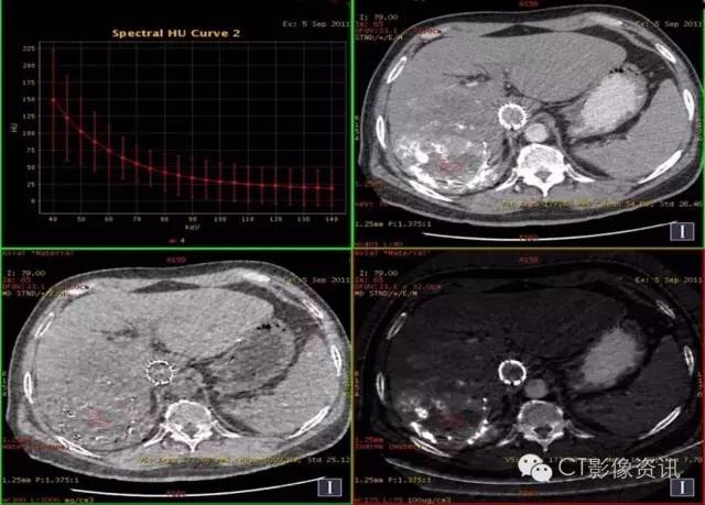 临床优势 肝癌栓塞后,因碘油和术后炎性反应的影响,短期内难以评估手术效果。通过能谱成像GSI分析,比较增强后碘含量与平扫时碘含量(有时可用水含量)的变化及变化趋势,来判断肝癌病灶是否还有强化,评估栓塞治疗的疗效和预后,并可指导临床进一步治疗。