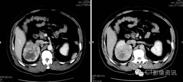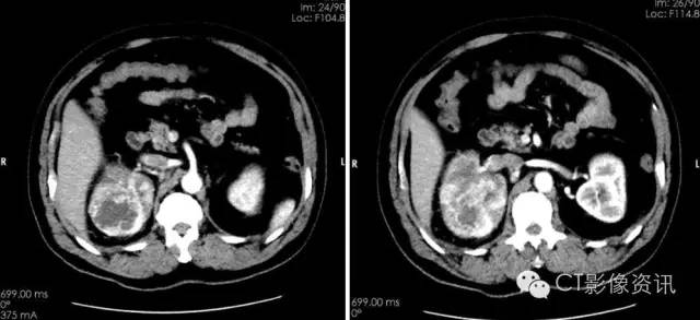 分泌期及排泄期可见病灶不均匀强化,对比与周围明显强化的肾脏组织,病灶边界清晰,实质内有不规则低密度坏死区。