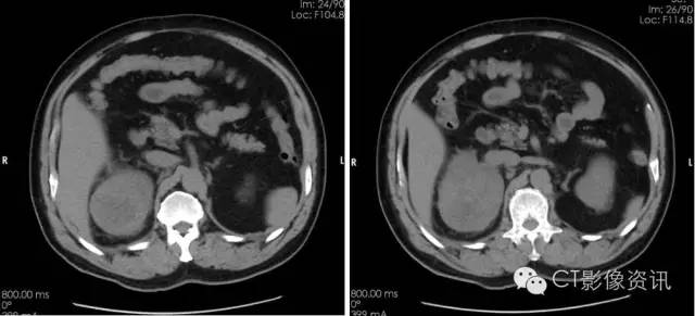 右肺结节能谱曲线与右肾上极肿块完全重合(图示为黄色和红色曲线)。
