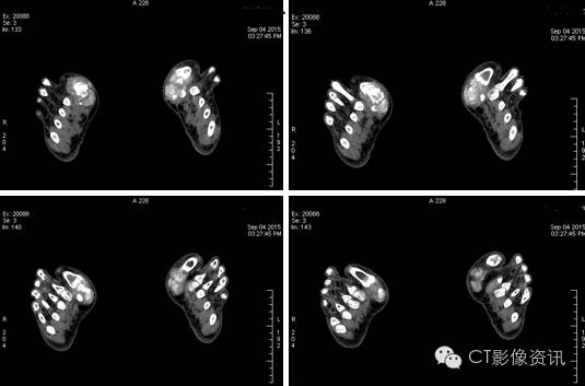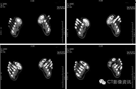 70keV单能图像:关节周围痛风结节沉积密度并不均匀,可以侵犯骨质,并夹杂着散在钙化。