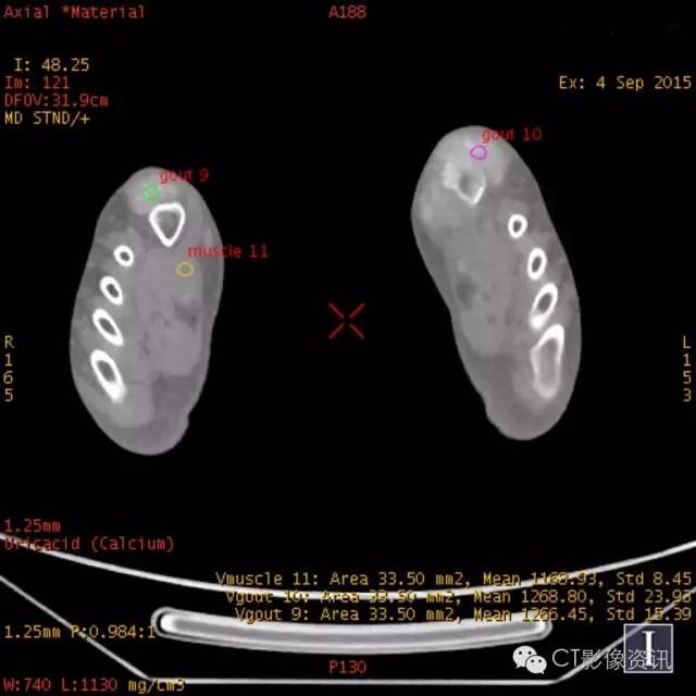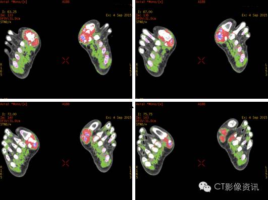 双阈值VOI:在尿酸基图像双阈值VOI生成伪彩图,不同物质用不同颜色表达。本例病变,红色代表痛风结节,夹杂蓝色代表痛风内合并的钙化,绿色代表肌肉软组织。