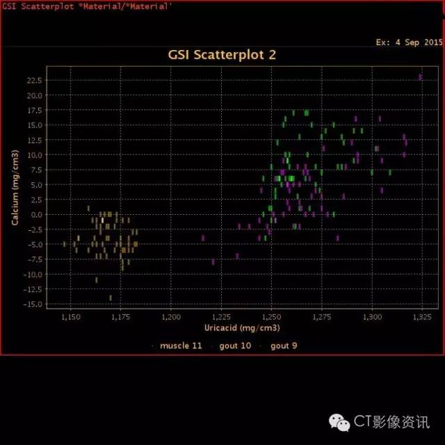 尿酸基图以及散点图上,明显的痛风结节与正常的肌肉软组织可以区分。