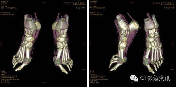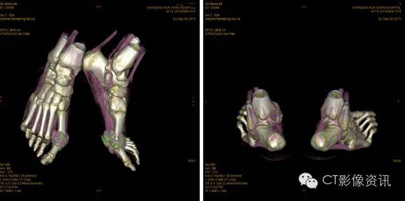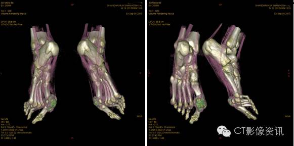 双足内多发关节痛风结节沉积。双侧第一近侧趾趾关节最为显著。痛风VR渲染为绿色结节。