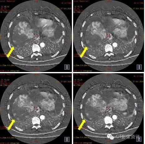 碘基图像对肝脏结节的血供显示更敏感,碘基图上我们可以看到更多清晰的小病灶。