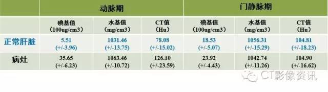 分别测量并计算正常肝脏及病灶在动脉期及门脉期的肝动脉碘分数(注1)及门脉碘含量(注2),结果见下表。