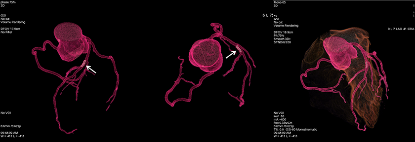 左前降支(LAD)中段长条状硬化斑块(白色箭头)