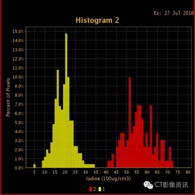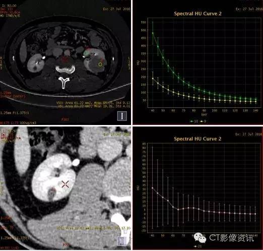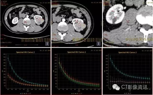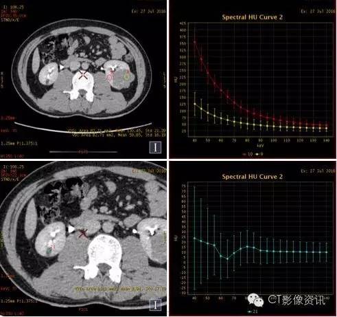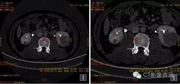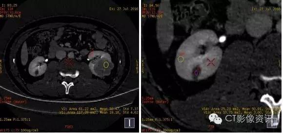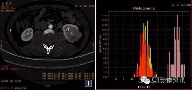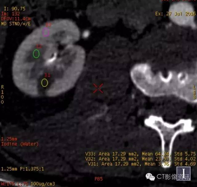 左肾病灶(红色ROI 2)基物质碘含量与左肾髓质(黄色ROI 1 )相似,与左肾皮质(粉色ROI 3)存在较大差异。 右肾病灶基物质碘含量与右肾皮质、髓质纯在较大差异。且左、右肾病灶基物质碘含量明显不同。(见表二)
