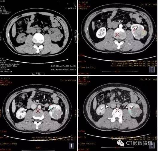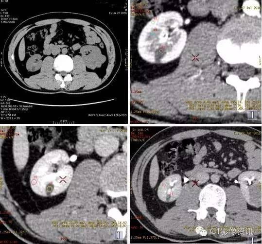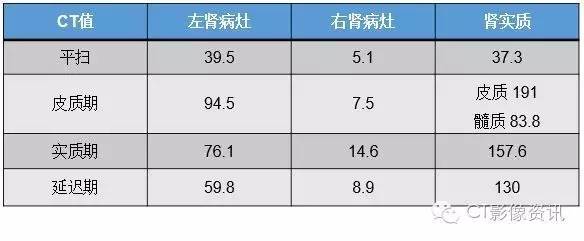 表一:双肾病灶及肾实质各期平扫及增强各期CT值测量结果