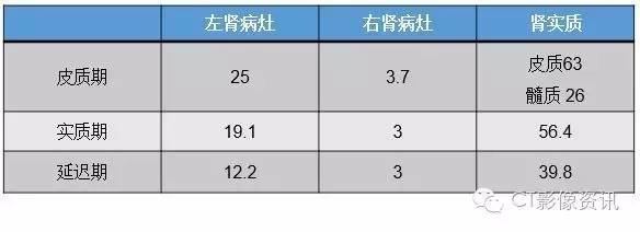 表二:增强能谱扫描双肾及肾实质各期碘基物质测量结果