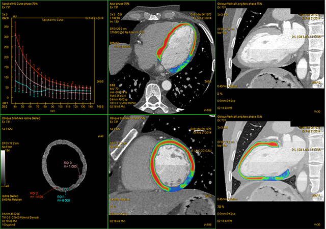心肌灌注是评价心肌活性的重要方法。冠脉能谱通过对碘进行定量测定以评估心肌血供。心肌缺血或梗死在碘基图上可显示某个分段的碘含量低于周围组织,提示该部位血流灌注降低或缺失,结合冠脉分支病变,可行解剖和功能同步诊断,指导制定正确的临床治疗方案